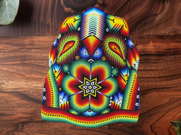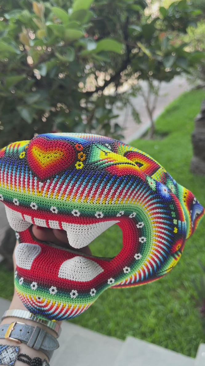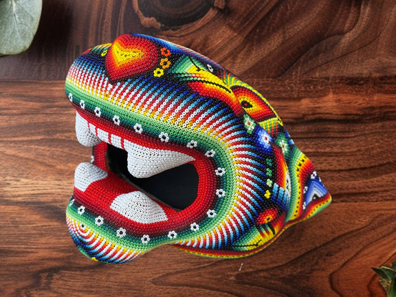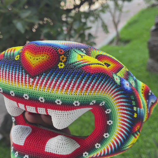 Se trata de una cabeza de jaguar tallada papel maché, posteriormente se forra con cera de campeche y se decora con millones de minicristales de chaquira, haciendo una verdadera obra de arte.