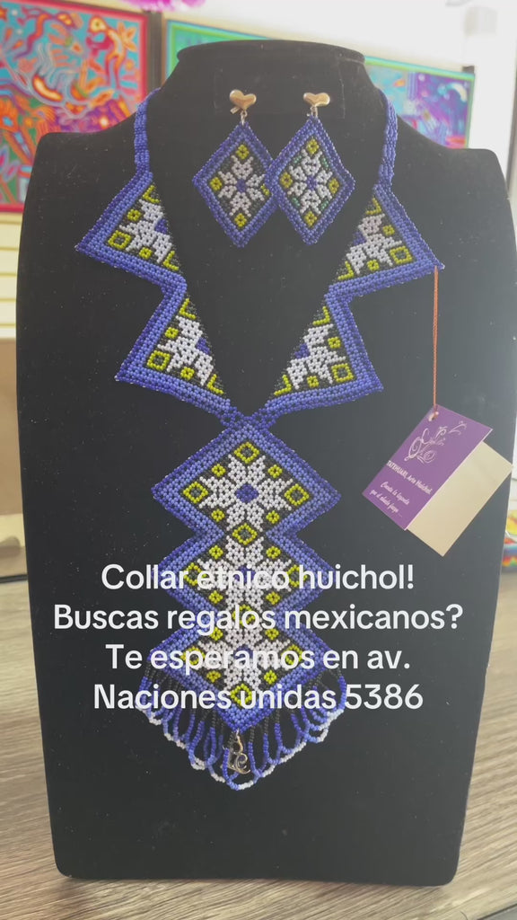 Arte Huichol.- Collar y aretes de chaquira realizados por los huicholes de Nayarit. La joyería hecha con cuentas de chaquira es un elemento importante en la indumentaria de los huicholes, es un excelente accesorio para combinar.