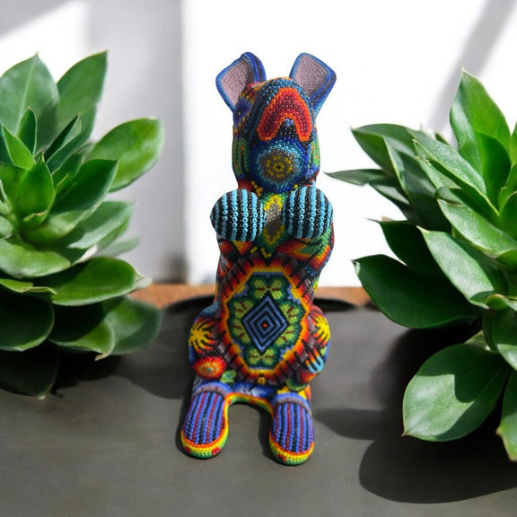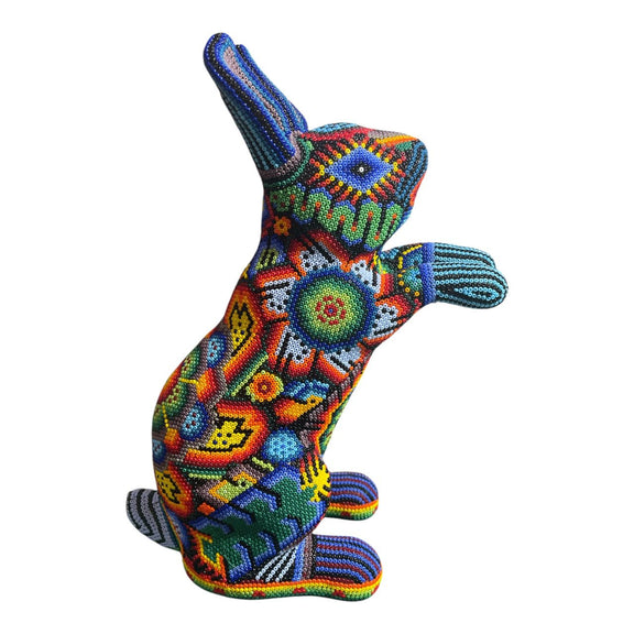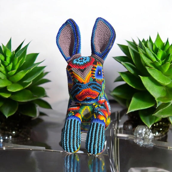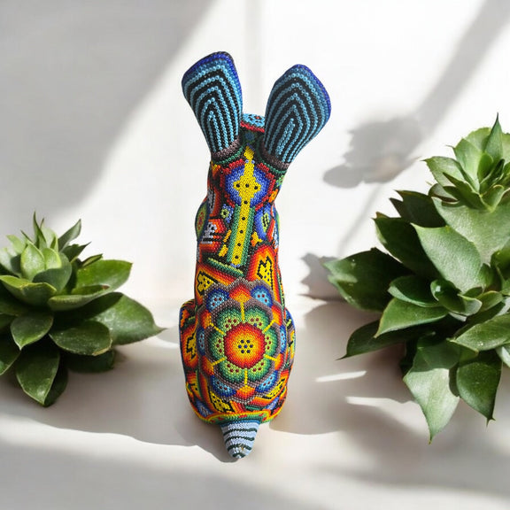 Hermosa pieza artesanal Huichol, una representación vibrante y llena de significado de nuestra cultura Mexicana. Elaborado a mano por talentosos artesanos huicholes, este conejo esta forrado por diminutas chaquiras que dan vida a sus impresionantes colores y patrones.