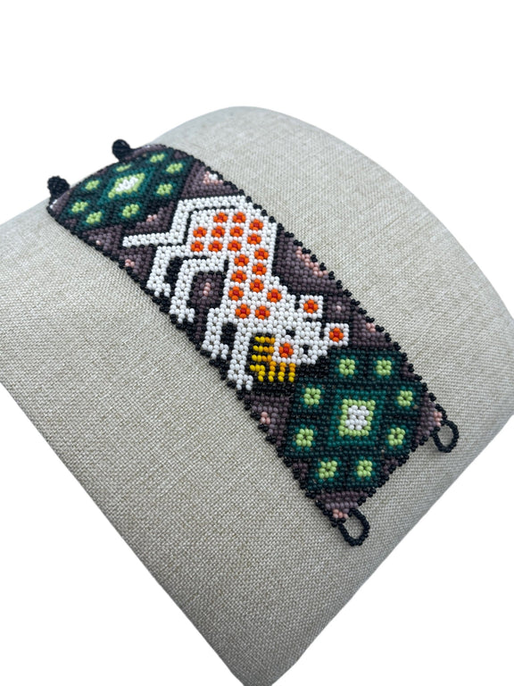Arte Huichol.- Pulsera de chaquira realizada por los huicholes de Nayarit. La joyería hecha con cuentas de chaquira es un elemento importante en la indumentaria de los huicholes y es un excelente accesorio para combinar.